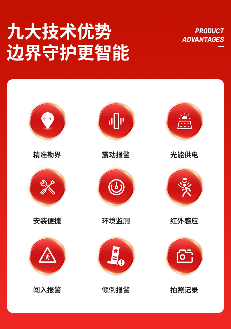 电子界桩是一种沿自然保护地边界、生态保护红线边界、国有林场边界按一定标准设立的电子地界标志桩。该产品综合运用了姿态传感、红外入侵、可见光图像传感等复合传感与人工智能(AI)技术,可精准监测界桩姿态、人员入侵、动物活动等现象。电子界桩利用NB-IoT/4G/有线通信接入云端,实现现场数据回传,及时掌控界桩姿态、现场环境、人类活动、动物活动等信息。该产品具备光能自供电、蜂窝组网等功能,不需铺设线缆、不需人工值守,具有部署灵活、安装简便、准确可靠等显著特点。