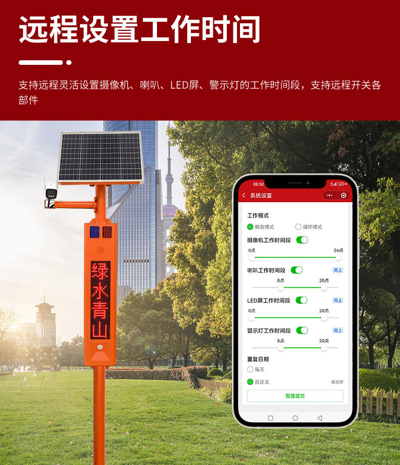 配套移动端小程序、APP和PC端平台可实现对设备的远端管理,包括远程设置LED宣传文字及语音播报内容、远程喊话、远程操控摄像头、远程监测供电情况、灵活配置各部件工作时段等。