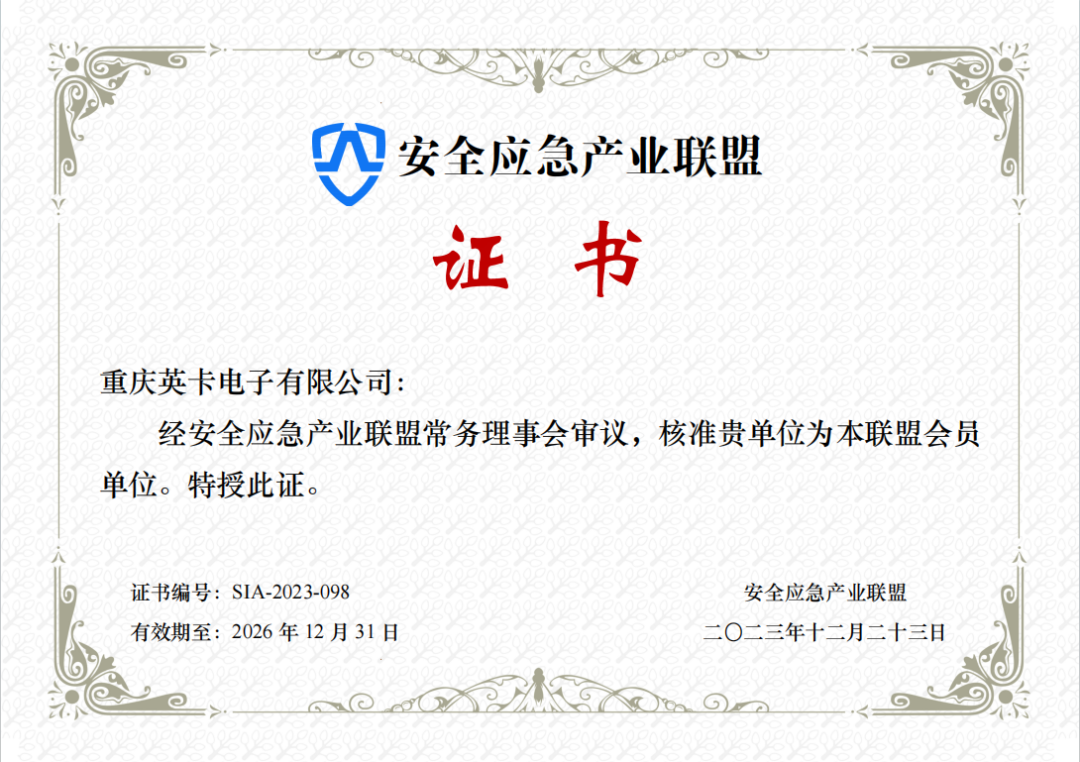 2023年12月,经安全应急产业联盟常务理事会审议决议,重庆英卡电子有限公司凭借林业领域良好的客户口碑和强大的技术研发能力,正式加入安全应急产业联盟,成为联盟会员单位,将为中国应急救援产业发展贡献出自己的力量。安全应急产业联盟对申请加入联盟的企业有着严苛的要求,英卡电子通过重重考核获此殊荣,充分证明了在安全应急领域和森林草原防灾减灾方面有着丰富经验和实战能力,同时也说明了公司软硬件产品和技术具有创新性、先行性和智能化等突出优势。
